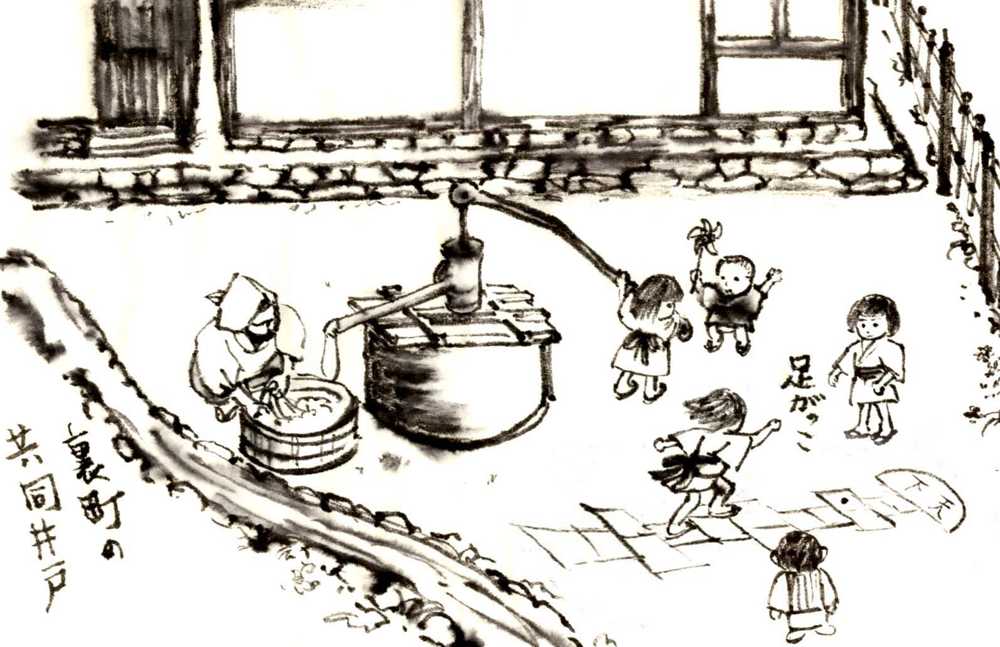 いつも足がっこをやっていた共同井戸端の流れに、少し大きく板で囲った洗い場があった。大根やお菜を洗うとき、少し大きな洗濯物を扱うときに使ったらしい。かなり深くなっていて、私が三つのときと思うが女の子たちが片足飛びをするのを真似て、洗い場の近くで遊んでいた。石につまづいたのか、よろけて頭から水に落ちた。すぐ気づいて走って来たのはミヨちゃん。びしょ濡れで泣き喚く私を父親の鍛冶場へ連れていき、裸にしてふいごの傍のおきの前で体を拭いてくれた。多分、寒い季節だったのだろう。私の母が駆けつけて裸の尻を叩かれたのを覚えている。